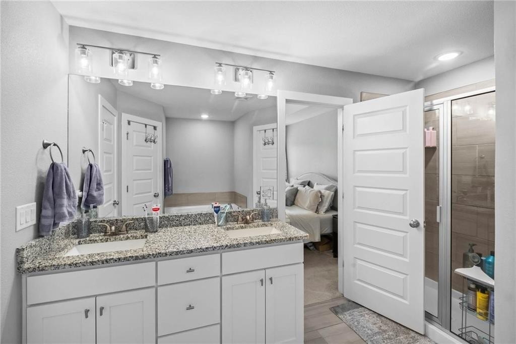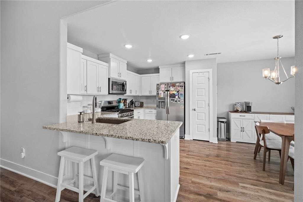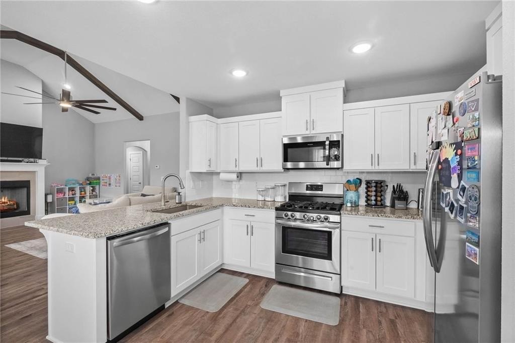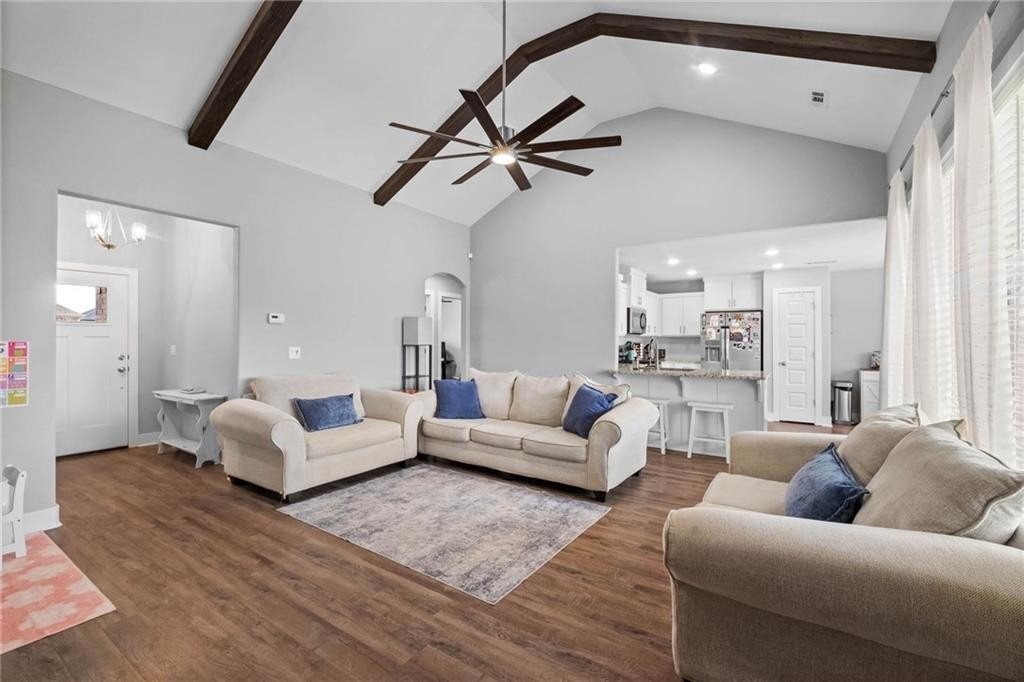 $7000 in closing costs paid by seller on this beautifully designed home with an open-concept highlighted by luxury vinyl plank flooring throughout the living spaces. The living room has stunning wood beams on the vaulted ceiling, and a wall of windows that fills the space with natural light. The modern kitchen offers granite countertops, crisp white cabinetry, stainless steel appliances, including fridge and gas range, pantry, and spacious dining area. The split floorplan features a private primary suite with trey ceiling and a luxurious ensuite complete with dual vanities, tile shower, soaking tub, and TWO walk-in closets, one for her and one for him. Two additional generously sized bedrooms and another full bathroom provide flexibility for kids, guests or a home office. Upgraded laundry room has cabinets and counterspace. Step outside to enjoy the fenced backyard, perfect for entertainment, covered porch to relax under and a shed for storage. The perfect home for your family with $7000 in closing costs paid!