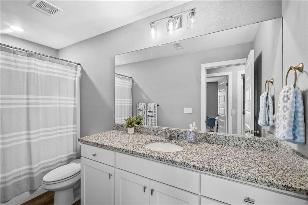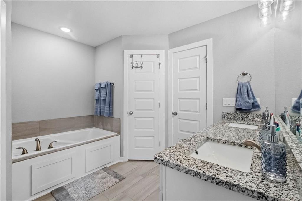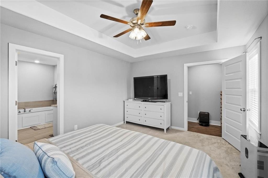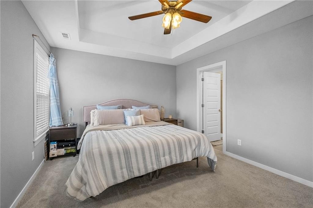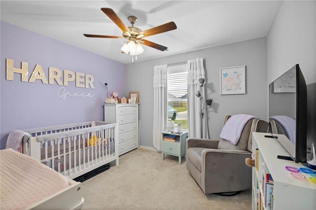 $7000 in closing costs paid by seller on this beautifully designed home with an open-concept highlighted by luxury vinyl plank flooring throughout the living spaces. The living room has stunning wood beams on the vaulted ceiling, and a wall of windows that fills the space with natural light. The modern kitchen offers granite countertops, crisp white cabinetry, stainless steel appliances, including fridge and gas range, pantry, and spacious dining area. The split floorplan features a private primary suite with trey ceiling and a luxurious ensuite complete with dual vanities, tile shower, soaking tub, and TWO walk-in closets, one for her and one for him. Two additional generously sized bedrooms and another full bathroom provide flexibility for kids, guests or a home office. Upgraded laundry room has cabinets and counterspace. Step outside to enjoy the fenced backyard, perfect for entertainment, covered porch to relax under and a shed for storage. The perfect home for your family with $7000 in closing costs paid!